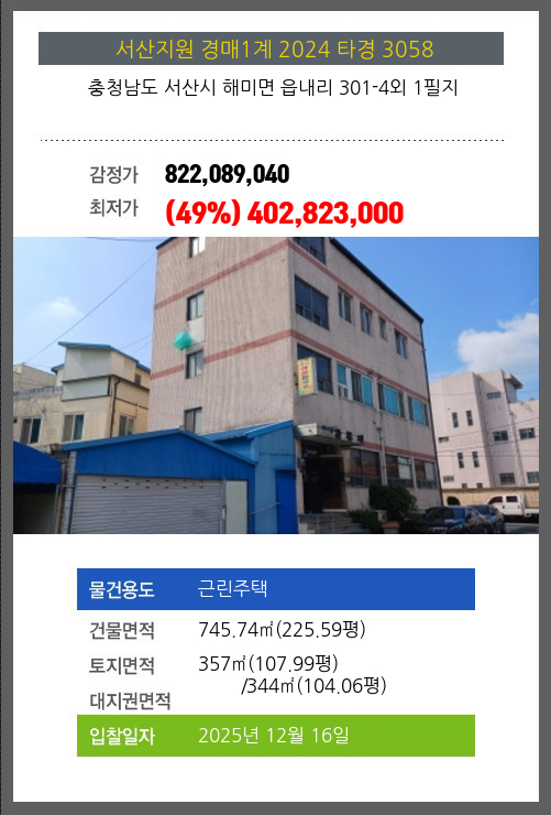 사건번호 2024 타경 3058 본건은 충청남도 서산시 해미면 읍내리 301-4외 1필지소재하는 근린주택경매 물건의 포스팅입니다. 건물면적 [ 745.74㎡ (225.59평) ]토지면적 [ 전체:357㎡ (107.99평) 매각지분:344㎡ (104.06평) ]