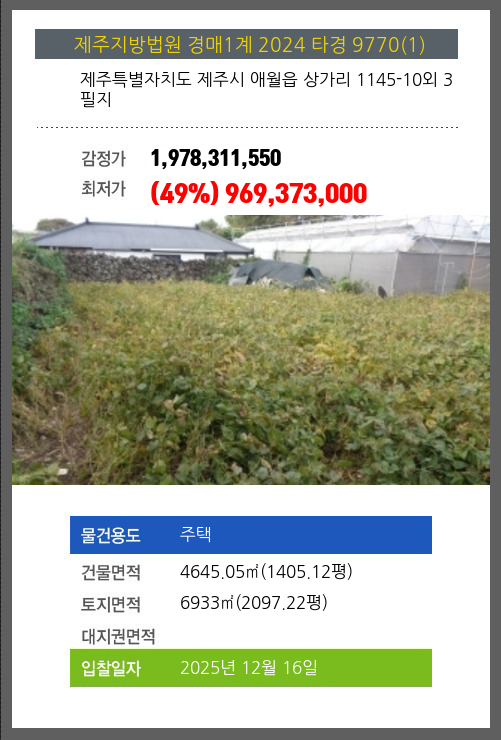 사건번호 2024 타경 9770(1) 본건은 제주특별자치도 제주시 애월읍 상가리 1145-10외 3필지소재하는 주택경매 물건의 포스팅입니다. 건물면적 [ 4645.05㎡ (1405.12평) ]토지면적 [ 6933㎡ (2097.22평) ] 시세를 반영한