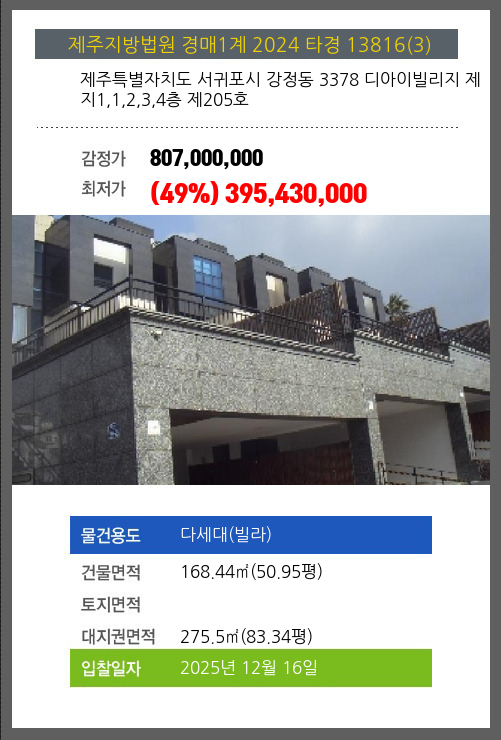 사건번호 2024 타경 13816(2) 본건은 제주특별자치도 서귀포시 강정동 3378 디아이빌리지 제지1,1,2,3,4층 제204호소재하는 다세대(빌라)경매 물건의 포스팅입니다. 건물면적 [ 168.44㎡ (50.95평) ]대지권 [ 275.5㎡ (83.34평) ] 시세를