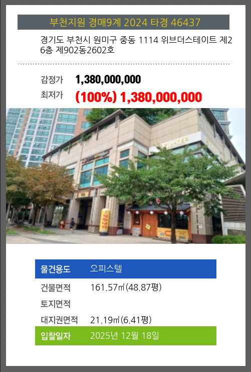 사건번호 2024 타경 46437 본건은 경기도 부천시 원미구 중동 1114 위브더스테이트 제26층 제902동2602호소재하는 오피스텔경매 물건의 포스팅입니다. 건물면적 [ 161.57㎡ (48.87평) ]대지권 [ 21.19㎡ (6.41평) ]