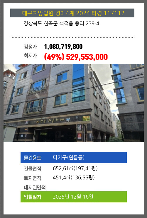 사건번호 2024 타경 117112 본건은 경상북도 칠곡군 석적읍 중리 239-4소재하는 다가구(원룸등)경매 물건의 포스팅입니다. 건물면적 [ 652.61㎡ (197.41평) ]토지면적 [ 451.4㎡ (136.55평) ] 시세를 반영한 감정가