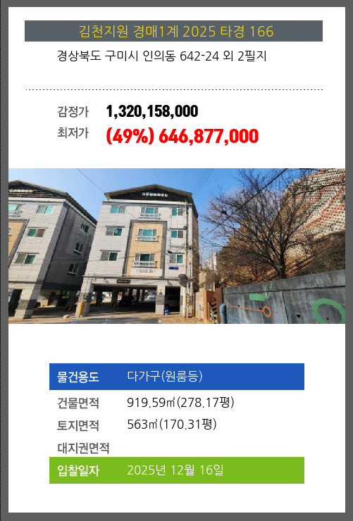 사건번호 2025 타경 166 본건은 경상북도 구미시 인의동 642-24 외 2필지소재하는 다가구(원룸등)경매 물건의 포스팅입니다. 건물면적 [ 919.59㎡ (278.17평) ]토지면적 [ 563㎡ (170.31평) ] 시세를 반영한
