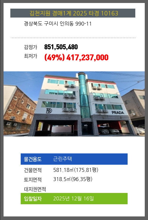 사건번호 2025 타경 10163 본건은 경상북도 구미시 인의동 990-11소재하는 근린주택경매 물건의 포스팅입니다. 건물면적 [ 581.18㎡ (175.81평) ]토지면적 [ 318.5㎡ (96.35평) ] 시세를 반영한 감정가 851,505,480에서2회
