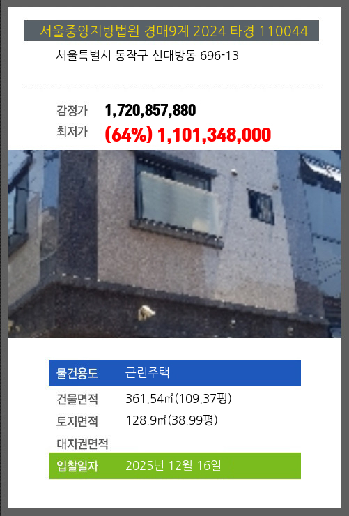 사건번호 2024 타경 110044 본건은 서울특별시 동작구 신대방동 696-13소재하는 근린주택경매 물건의 포스팅입니다. 건물면적 [ 361.54㎡ (109.37평) ]토지면적 [ 128.9㎡ (38.99평) ] 시세를 반영한 감정가 1,720,857,880에서2회