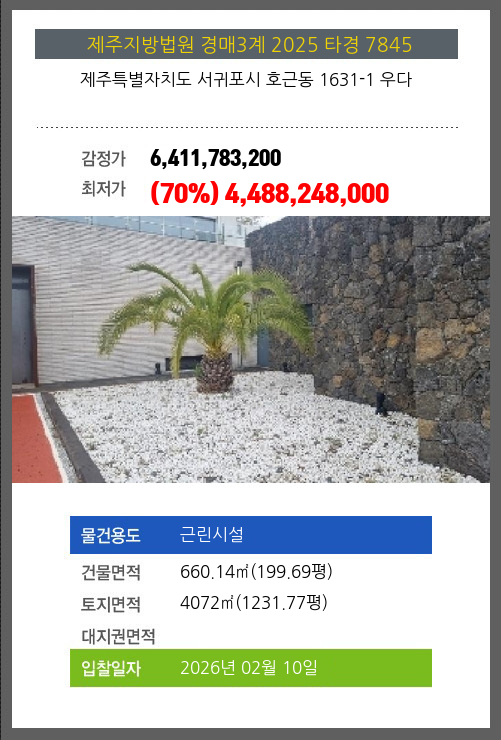 사건번호 2025 타경 7845 본건은 제주특별자치도 서귀포시 호근동 1631-1 우다소재하는 근린시설경매 물건의 포스팅입니다. 건물면적 [ 660.14㎡ (199.69평) ]토지면적 [ 4072㎡ (1231.77평) ] 시세를 반영한 감정가