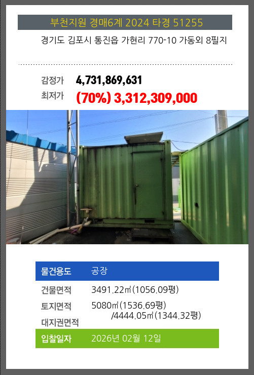 사건번호 2024 타경 51255 본건은 경기도 김포시 통진읍 가현리 770-10 가동외 8필지소재하는 공장경매 물건의 포스팅입니다. 건물면적 [ 3491.22㎡ (1056.09평) ]토지면적 [ 전체:5080㎡ (1536.69평) 매각지분:4444.05㎡ (1344.32평)