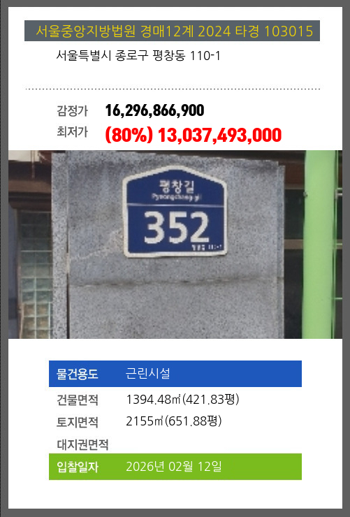 사건번호 2024 타경 103015 본건은 서울특별시 종로구 평창동 110-1소재하는 근린시설경매 물건의 포스팅입니다. 건물면적 [ 1394.48㎡ (421.83평) ]토지면적 [ 2155㎡ (651.88평) ] 시세를 반영한 감정가 16,296,866,900에서1회
