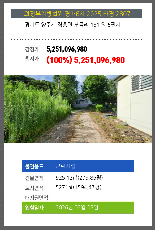 사건번호 2025 타경 2807 본건은 경기도 양주시 장흥면 부곡리 151 외 5필지소재하는 근린시설경매 물건의 포스팅입니다. 건물면적 [ 925.12㎡ (279.85평) ]토지면적 [ 5271㎡ (1594.47평) ] 시세를