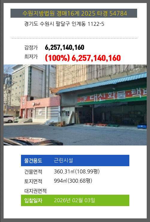 사건번호 2025 타경 54784 본건은 경기도 수원시 팔달구 인계동 1122-5소재하는 근린시설경매 물건의 포스팅입니다. 건물면적 [ 360.31㎡ (108.99평) ]토지면적 [ 994㎡ (300.68평) ] 시세를 반영한 감정가