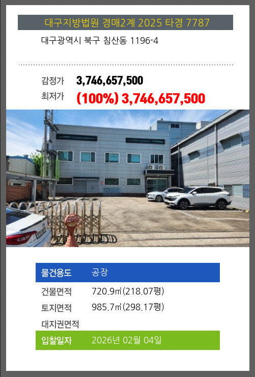 사건번호 2025 타경 7787 본건은 대구광역시 북구 침산동 1196-4소재하는 공장경매 물건의 포스팅입니다. 건물면적 [ 720.9㎡ (218.07평) ]토지면적 [ 985.7㎡ (298.17평) ] 시세를 반영한 감정가 3,746,657,500에서신건으로