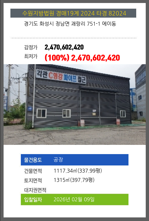 사건번호 2024 타경 82024 본건은 경기도 화성시 정남면 괘랑리 751-1 에이동소재하는 공장경매 물건의 포스팅입니다. 건물면적 [ 1117.34㎡ (337.99평) ]토지면적 [ 1315㎡ (397.79평) ] 시세를 반영한