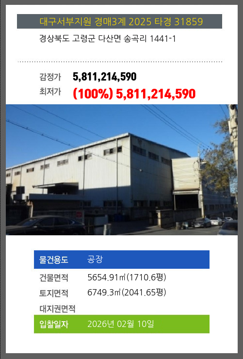 사건번호 2025 타경 31859 본건은 경상북도 고령군 다산면 송곡리 1441-1소재하는 공장경매 물건의 포스팅입니다. 건물면적 [ 5654.91㎡ (1710.6평) ]토지면적 [ 6749.3㎡ (2041.65평) ] 시세를 반영한 감정가
