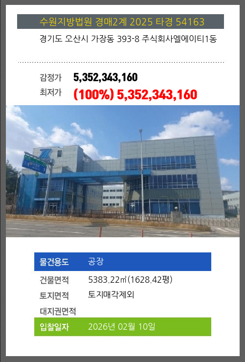 사건번호 2025 타경 54163 본건은 경기도 오산시 가장동 393-8 주식회사엘에이티1동소재하는 공장경매 물건의 포스팅입니다. 건물면적 [ 5383.22㎡ (1628.42평) ]토지면적 [ 토지 매각제외 ] 시세를 반영한 감정가