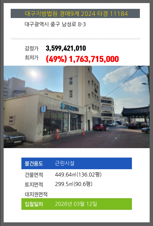 사건번호 2024 타경 11184 본건은 대구광역시 중구 남성로 8-3소재하는 근린시설경매 물건의 포스팅입니다. 건물면적 [ 449.64㎡ (136.02평) ]토지면적 [ 299.5㎡ (90.6평) ] 시세를 반영한 감정가 3,599,421,010에서2회