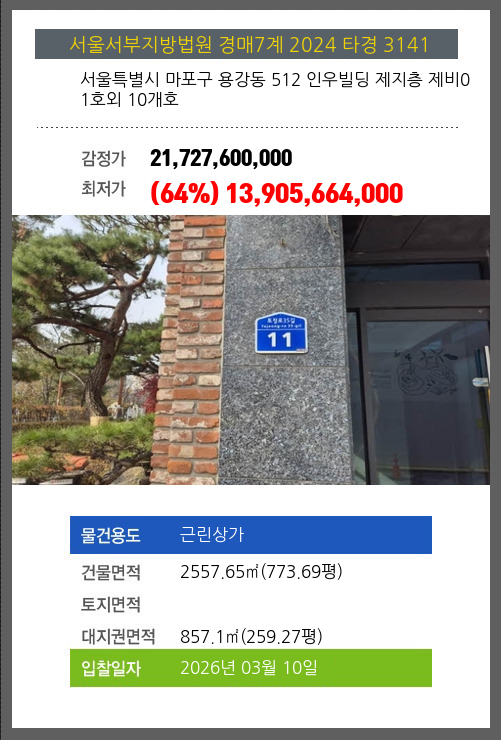 사건번호 2024 타경 3141 본건은 서울특별시 마포구 용강동 512 인우빌딩 제지층 제비01호외 10개호소재하는 근린상가경매 물건의 포스팅입니다. 건물면적 [ 2557.65㎡ (773.69평) ]대지권 [ 857.1㎡ (259.27평) ]