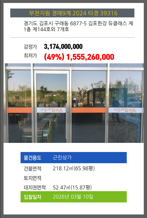 사건번호 2024 타경 39316 본건은 경기도 김포시 구래동 6877-5 김포한강 듀클래스 제1층 제144호외 7개호소재하는 근린상가경매 물건의 포스팅입니다. 건물면적 [ 218.12㎡ (65.98평) ]대지권 [ 52.47㎡ (15.87평)
