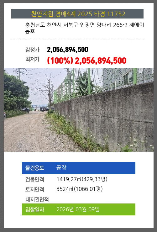 사건번호 2025 타경 55311 본건은 경기도 화성시 만세구 장안면 독정리 654 외 1필지소재하는 공장경매 물건의 포스팅입니다. 건물면적 [ 1512.69㎡ (457.59평) ]토지면적 [ 2741㎡ (829.15평) ]
