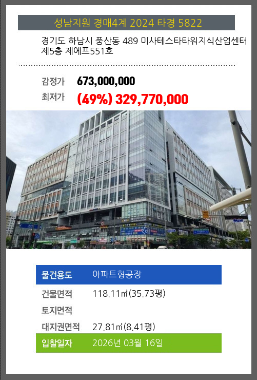 사건번호 2024 타경 5822 본건은 경기도 하남시 풍산동 489 미사테스타타워지식산업센터 제5층 제에프551호소재하는 아파트형공장경매 물건의 포스팅입니다. 건물면적 [ 118.11㎡ (35.73평) ]대지권 [ 27.81㎡ (8.41평) ] 시세를