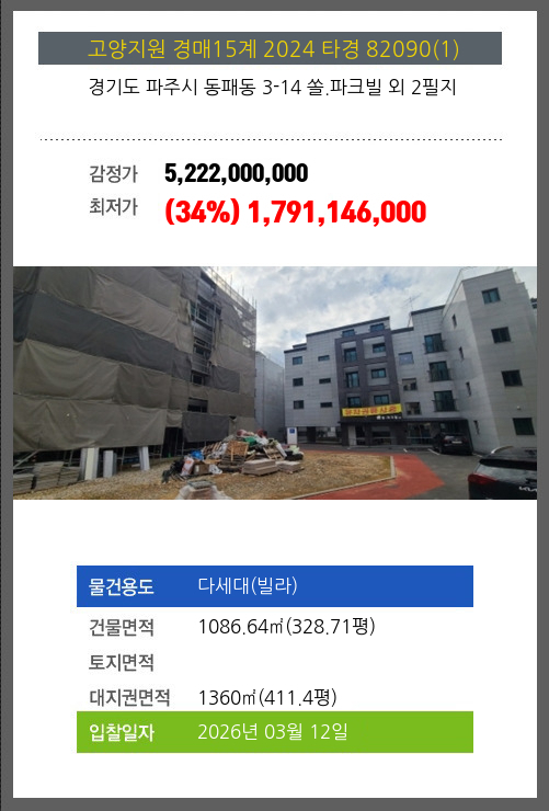 사건번호 2024 타경 82090(1) 본건은 경기도 파주시 동패동 3-14 쏠.파크빌 외 2필지소재하는 다세대(빌라)경매 물건의 포스팅입니다. 건물면적 [ 1086.64㎡ (328.71평) ]대지권 [ 1360㎡ (411.4평) ] 시세를