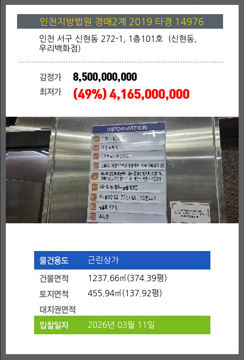 사건번호 2019 타경 14976 본건은 인천 서구 신현동 272-1, 1층101호 (신현동,우리백화점)소재하는 근린상가경매 물건의 포스팅입니다. 건물면적 [ 1237.66㎡ (374.39평) ]토지면적 [ 455.94㎡ (137.92평) ] 시세를 반영한