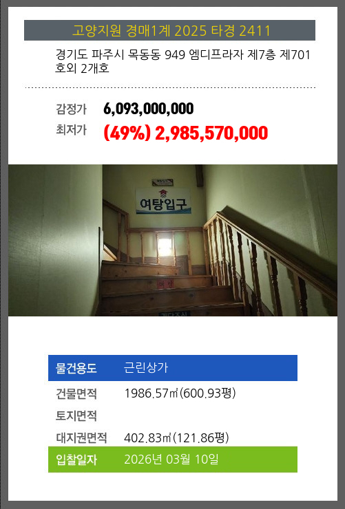 사건번호 2025 타경 2411 본건은 경기도 파주시 목동동 949 엠디프라자 제7층 제701호외 2개호소재하는 근린상가경매 물건의 포스팅입니다. 건물면적 [ 1986.57㎡ (600.93평) ]대지권 [ 402.83㎡ (121.86평) ]