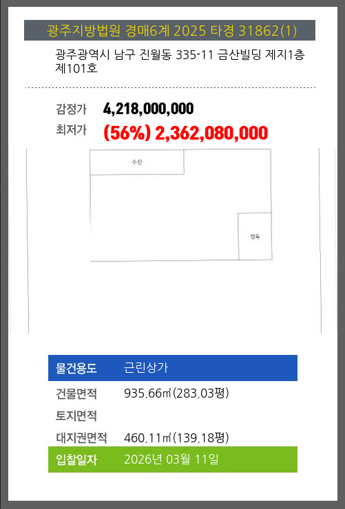 사건번호 2025 타경 31862(1) 본건은 광주광역시 남구 진월동 335-11 금산빌딩 제지1층 제101호소재하는 근린상가경매 물건의 포스팅입니다. 건물면적 [ 935.66㎡ (283.03평) ]대지권 [ 460.11㎡ (139.18평) ] 시세를