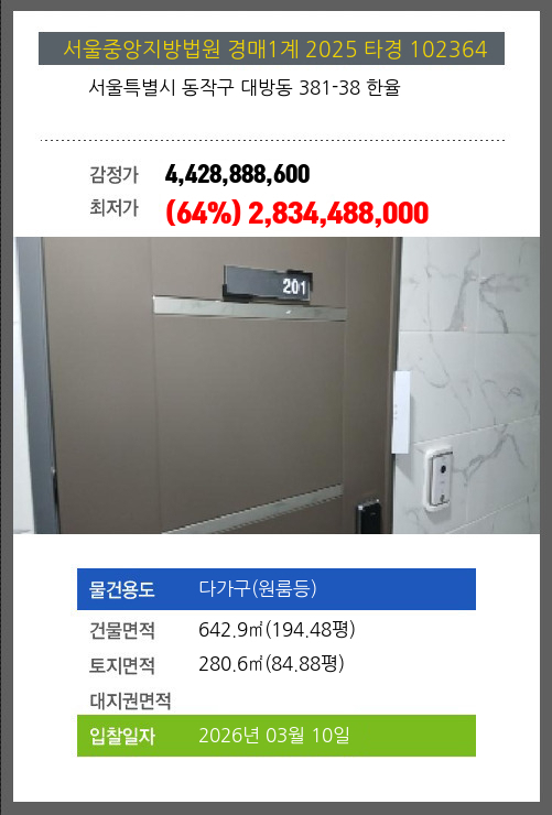 사건번호 2025 타경 102364 본건은 서울특별시 동작구 대방동 381-38 한율소재하는 다가구(원룸등)경매 물건의 포스팅입니다. 건물면적 [ 642.9㎡ (194.48평) ]토지면적 [ 280.6㎡ (84.88평) ] 시세를 반영한 감정가