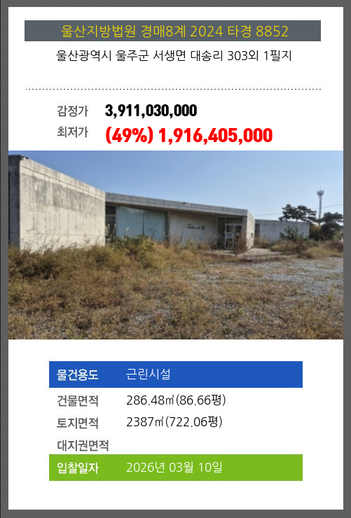 사건번호 2024 타경 8852 본건은 울산광역시 울주군 서생면 대송리 303외 1필지소재하는 근린시설경매 물건의 포스팅입니다. 건물면적 [ 286.48㎡ (86.66평) ]토지면적 [ 2387㎡ (722.06평) ] 시세를 반영한