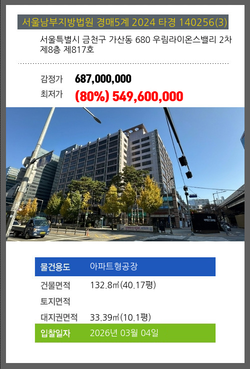 사건번호 2024 타경 140256(3) 본건은 서울특별시 금천구 가산동 680 우림라이온스밸리 2차 제8층 제817호소재하는 아파트형공장경매 물건의 포스팅입니다. 건물면적 [ 132.8㎡ (40.17평) ]대지권 [ 33.39㎡ (10.1평) ]