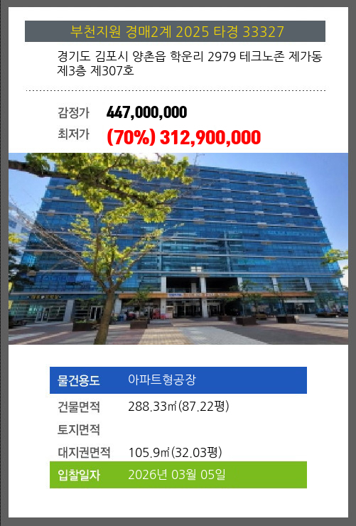 사건번호 2025 타경 33327 본건은 경기도 김포시 양촌읍 학운리 2979 테크노존 제가동 제3층 제307호소재하는 아파트형공장경매 물건의 포스팅입니다. 건물면적 [ 288.33㎡ (87.22평) ]대지권 [ 105.9㎡ (32.03평)