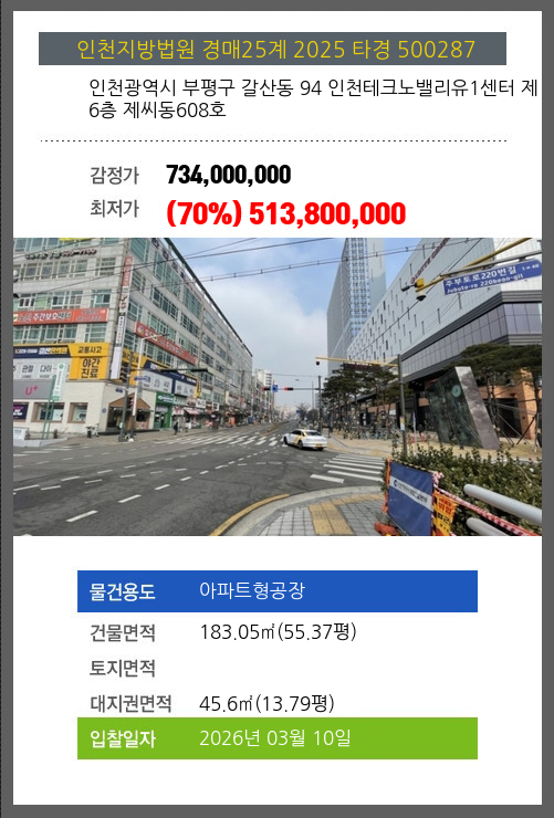 사건번호 2025 타경 500287 본건은 인천광역시 부평구 갈산동 94 인천테크노밸리유1센터 제6층 제씨동608호소재하는 아파트형공장경매 물건의 포스팅입니다. 건물면적 [ 183.05㎡ (55.37평) ]대지권 [ 45.6㎡ (13.79평) ] 시세를