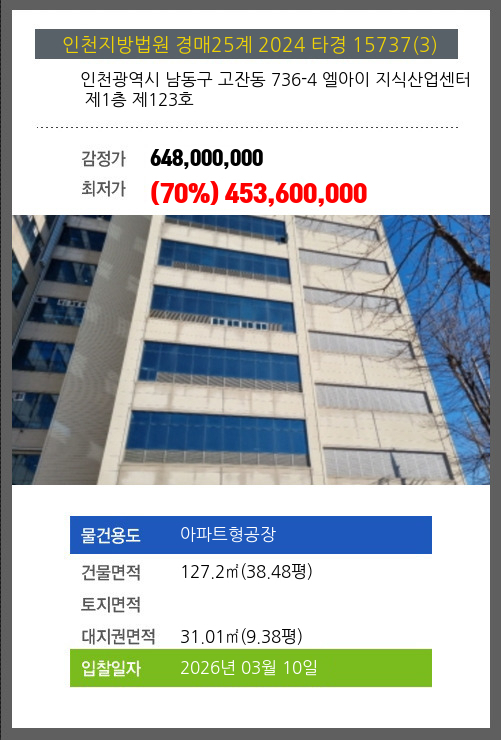 사건번호 2024 타경 15737(1) 본건은 인천광역시 남동구 고잔동 736-4 엘아이 지식산업센터 제1층 제121호소재하는 아파트형공장경매 물건의 포스팅입니다. 건물면적 [ 127.2㎡ (38.48평) ]대지권 [ 31.01㎡ (9.38평) ]