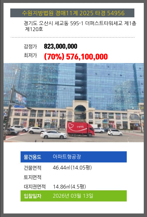 사건번호 2025 타경 54956 본건은 경기도 오산시 세교동 595-1 더퍼스트타워세교 제1층 제120호소재하는 아파트형공장경매 물건의 포스팅입니다. 건물면적 [ 46.44㎡ (14.05평) ]대지권 [ 14.86㎡ (4.5평) ] 시세를