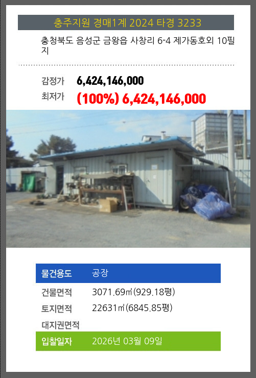 사건번호 2024 타경 3233 본건은 충청북도 음성군 금왕읍 사창리 6-4 제가동호외 10필지소재하는 공장경매 물건의 포스팅입니다. 건물면적 [ 3071.69㎡ (929.18평) ]토지면적 [ 22631㎡ (6845.85평) ] 시세를