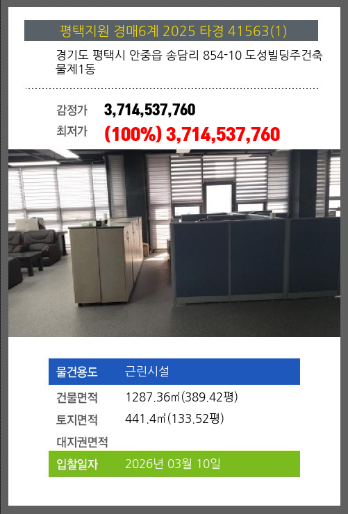 사건번호 2025 타경 41563(1) 본건은 경기도 평택시 안중읍 송담리 854-10 도성빌딩주건축물제1동소재하는 근린시설경매 물건의 포스팅입니다. 건물면적 [ 1287.36㎡ (389.42평) ]토지면적 [ 441.4㎡ (133.52평) ] 시세를 반영한