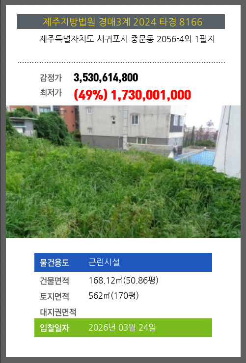 사건번호 2024 타경 8166 본건은 제주특별자치도 서귀포시 중문동 2056-4외 1필지소재하는 근린시설경매 물건의 포스팅입니다. 건물면적 [ 168.12㎡ (50.86평) ]토지면적 [ 562㎡ (170평) ] 시세를 반영한 감정가