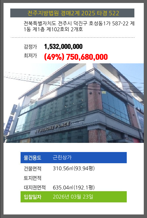 사건번호 2025 타경 522 본건은 전북특별자치도 전주시 덕진구 호성동1가 587-22 제1동 제1층 제102호외 2개호소재하는 근린상가경매 물건의 포스팅입니다. 건물면적 [ 310.56㎡ (93.94평) ]대지권 [ 635.04㎡ (192.1평)