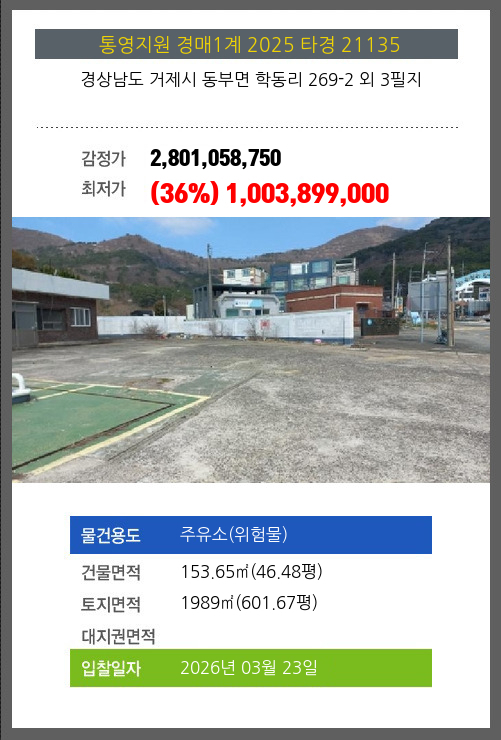 사건번호 2025 타경 21135 본건은 경상남도 거제시 동부면 학동리 269-2 외 3필지소재하는 주유소(위험물)경매 물건의 포스팅입니다. 건물면적 [ 153.65㎡ (46.48평) ]토지면적 [ 1989㎡ (601.67평) ] 시세를