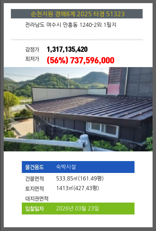 사건번호 2025 타경 51323 본건은 전라남도 여수시 만흥동 1240-2외 1필지소재하는 숙박시설경매 물건의 포스팅입니다. 건물면적 [ 533.85㎡ (161.49평) ]토지면적 [ 1413㎡ (427.43평) ] 시세를 반영한 감정가