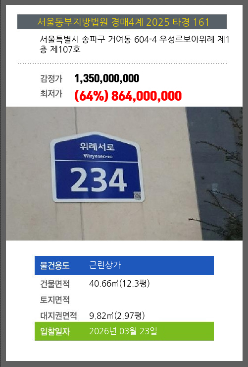 사건번호 2025 타경 161 본건은 서울특별시 송파구 거여동 604-4 우성르보아위례 제1층 제107호소재하는 근린상가경매 물건의 포스팅입니다. 건물면적 [ 40.66㎡ (12.3평) ]대지권 [ 9.82㎡ (2.97평) ] 시세를