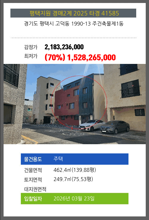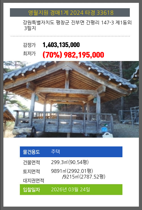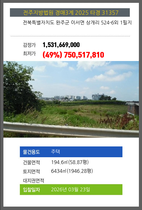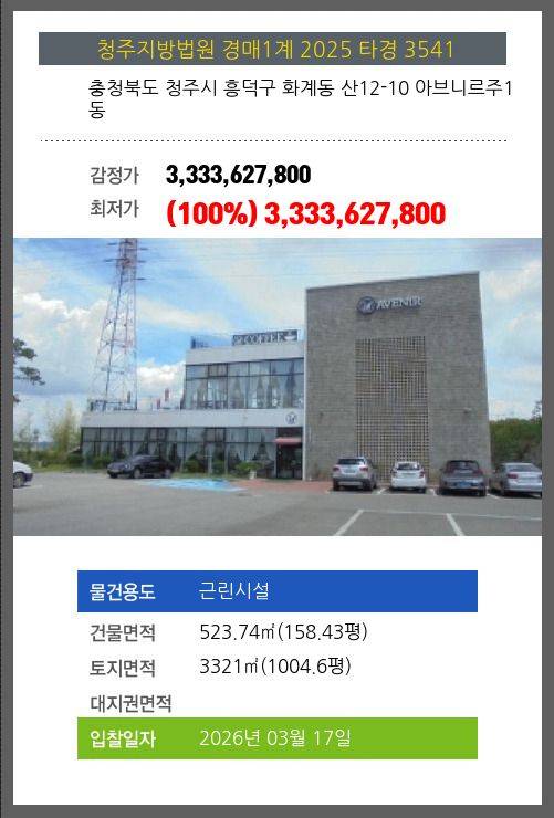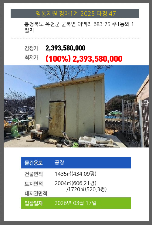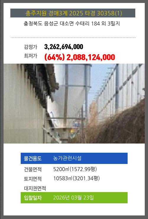 사건번호 2025 타경 30358(1) 본건은 충청북도 음성군 대소면 수태리 184 외 3필지소재하는 농가관련시설경매 물건의 포스팅입니다. 건물면적 [ 5200㎡ (1572.99평) ]토지면적 [ 10583㎡ (3201.34평) ] 시세를