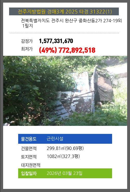 사건번호 2025 타경 31322(1) 본건은 전북특별자치도 전주시 완산구 중화산동2가 274-19외 1필지소재하는 근린시설경매 물건의 포스팅입니다. 건물면적 [ 299.81㎡ (90.69평) ]토지면적 [ 1082㎡ (327.3평) ] 시세를 반영한