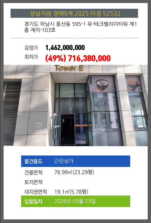 사건번호 2025 타경 52532 본건은 경기도 하남시 풍산동 595-1 유-테크밸리이타워 제1층 제이-103호소재하는 근린상가경매 물건의 포스팅입니다. 건물면적 [ 76.99㎡ (23.29평) ]대지권 [ 19.1㎡ (5.78평) ] 시세를