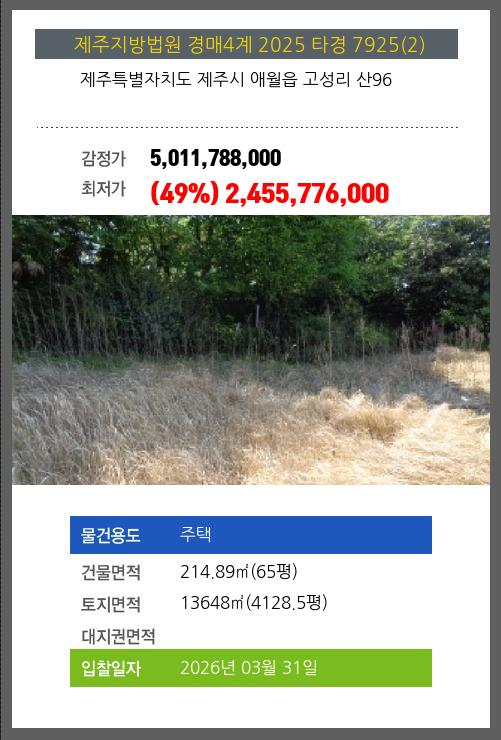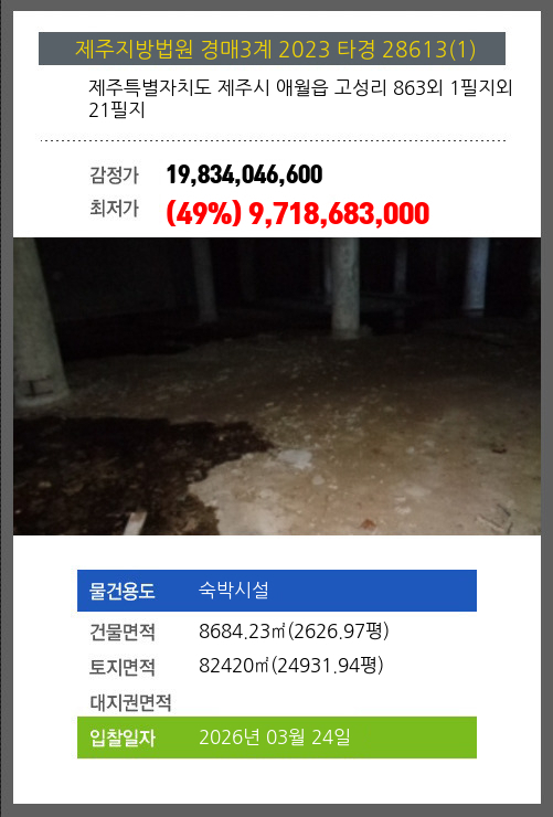 사건번호 2023 타경 28613(1) 본건은 제주특별자치도 제주시 애월읍 고성리 863외 1필지외 21필지소재하는 숙박시설경매 물건의 포스팅입니다. 건물면적 [ 8684.23㎡ (2626.97평) ]토지면적 [ 82420㎡ (24931.94평) ] 시세를