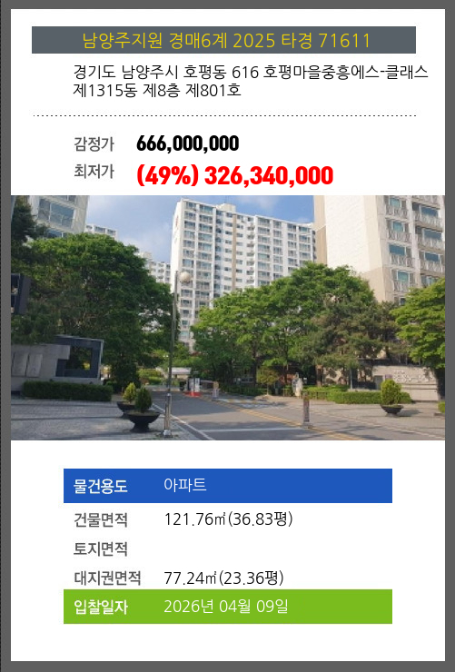 사건번호 2025 타경 71611 본건은 경기도 남양주시 호평동 616 호평마을중흥에스-클래스 제1315동 제8층 제801호소재하는 아파트경매 물건의 포스팅입니다. 건물면적 [ 121.76㎡ (36.83평) ]대지권 [ 77.24㎡ (23.36평) ]