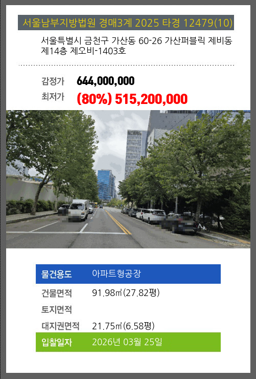 사건번호 2025 타경 12479(10) 본건은 서울특별시 금천구 가산동 60-26 가산퍼블릭 제비동 제14층 제오비-1403호소재하는 아파트형공장경매 물건의 포스팅입니다. 건물면적 [ 91.98㎡ (27.82평) ]대지권 [ 21.75㎡ (6.58평) ]