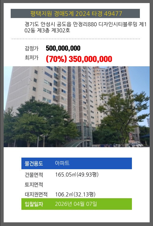 사건번호 2024 타경 49477 본건은 경기도 안성시 공도읍 만정리880 디자인시티블루밍 제102동 제3층 제302호소재하는 아파트경매 물건의 포스팅입니다. 건물면적 [ 165.05㎡ (49.93평) ]대지권 [ 106.2㎡ (32.13평) ]