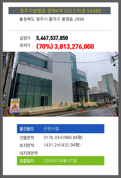 사건번호 2023 타경 56480 본건은 충청북도 청주시 흥덕구 봉명동 2694소재하는 근린시설경매 물건의 포스팅입니다. 건물면적 [ 3176.33㎡ (960.84평) ]토지면적 [ 1431.2㎡ (432.94평) ] 시세를 반영한 감정가
