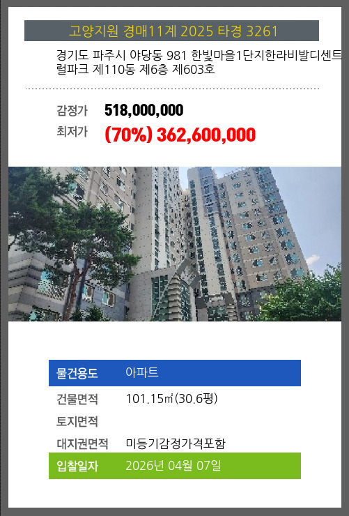 사건번호 2025 타경 3261 본건은 경기도 파주시 야당동 981 한빛마을1단지한라비발디센트럴파크 제110동 제6층 제603호소재하는 아파트경매 물건의 포스팅입니다. 건물면적 [ 101.15㎡ (30.6평) ]대지권 [ 미등기감정가격포함 ] 시세를