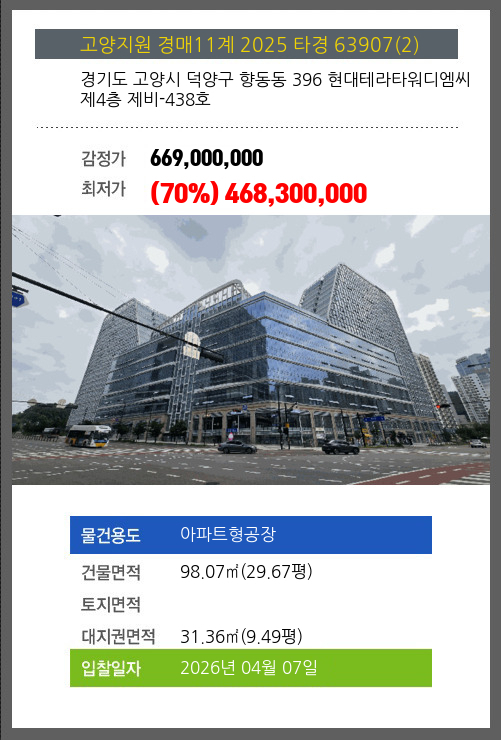 사건번호 2025 타경 63907(2) 본건은 경기도 고양시 덕양구 향동동 396 현대테라타워디엠씨 제4층 제비-438호소재하는 아파트형공장경매 물건의 포스팅입니다. 건물면적 [ 98.07㎡ (29.67평) ]대지권 [ 31.36㎡ (9.49평) ]
